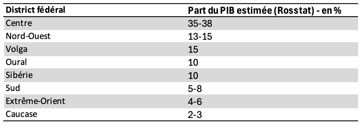 Le district fédéral central, dominé par Moscou, concentre 35 à 38 % du PIB annuel.